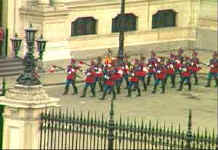 En la actualidad cuenta con un patio de honor delantero (en la foto, el cambio de guardia de los H�sares de Jun�n), un bello enrejado y la residencia presidencial en la parte posterior. Contiene en su interior valios�simo mobiliario e importantes cuadros de la pintura peruana de los siglos XIX y XX.